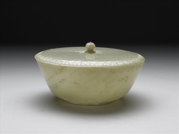 玉質,局部泛綠。圓碗侈口深腹淺圈足,口沿及腹壁下方,各琢一圈簡化莨苕葉紋。帶平蓋,蓋沿及蓋鈕下各琢一周簡化莨苕葉紋。蓋鈕頂以金絲繞嵌紫紅色剛玉一粒。金絲部份是用金箔包黃膠而成,金箔破損而露出黃膠。