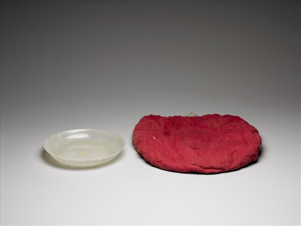 玉質,局部有白色斑點。口外撇,弧形淺壁,有圈足。壁薄可透光。附束繩布套。