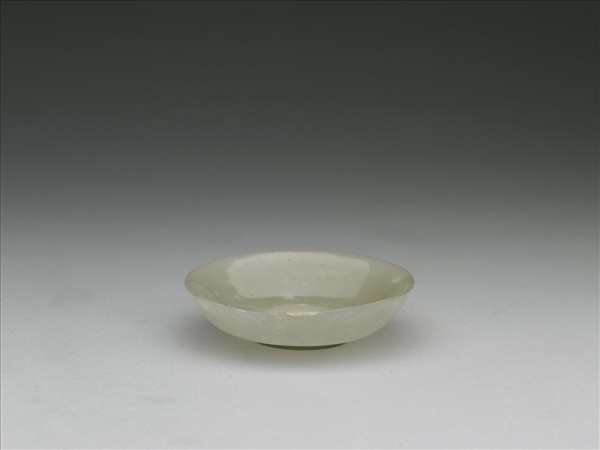 淺黃灰色玉,琢一很小巧的淺碟。另以圓片貼於器下方作為器底。