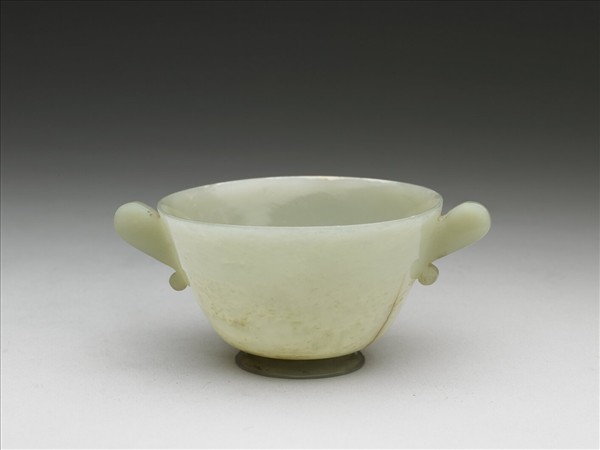 玉質,琢一小圓碗,帶人耳形的雙柄。器底另貼一片略帶外侈的玉片,再於中央磨出圓凹。