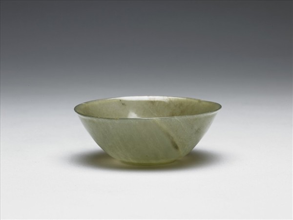 青綠泛灰色玉,琢一小圓碗,碗口不太圓正,器底為一片不甚規整的圓片,但已拋光。