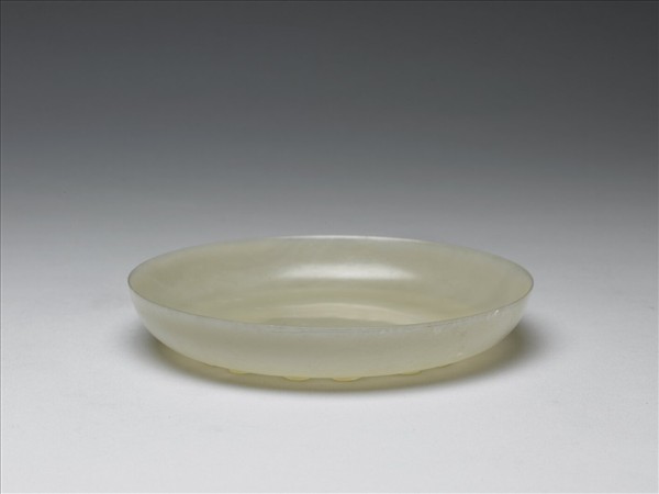 玉質,琢一淺圓盤。器壁厚實,器底琢一平展的雙層八瓣花,甚為僵化。器表拋光粗啞。