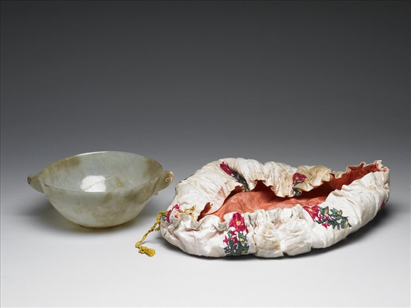 玉質,有大片赭斑,局部有裂璺。雙耳,弧形壁,有圈足,耳作人耳朵形。壁薄可透光。為痕都斯坦風格玉器。附束繩繡花布套。