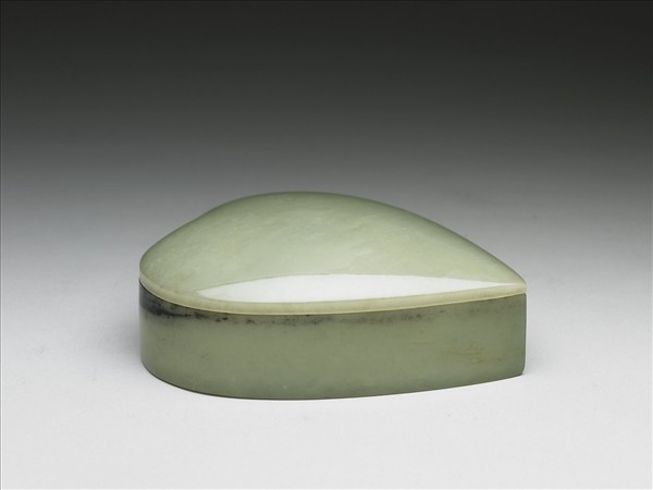 玉質,帶大條灰黑斑。琢一光素的葉形盒,蓋子與器身分開不相連,也無蓋鈕。