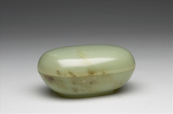 青玉帶淺褐斑。琢作橢圓盒,器蓋與器身高度相若,橢圓形圈足。器壁略厚,拋光不細潤。