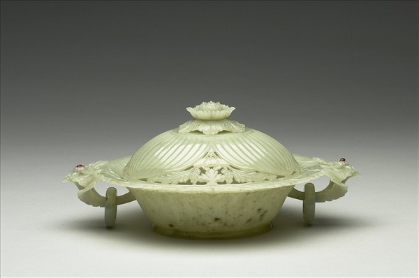 玉質,玉色泛白帶赭斑。附蓋,撇口、兩活環耳、斜壁,有圈足。蓋鈕和耳皆做立雕莨苕花葉,二耳花心並嵌有紅玻璃。蓋面飾有直棱紋花瓣三片,並鏤雕莨苕花葉。口沿雕作花瓣形,圈足內並作平展四瓣花。此件雖為痕都斯坦玉器,但可見受中國玉器造形影響之處。附束繩繡花布套。