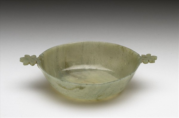 玉質,玉色泛灰,有白綹及赭斑。兩耳、弧形壁、平底。耳作平展的幾何六瓣花形立雕。壁薄可透光。為痕都斯坦風格玉器。附束繩印花布套。