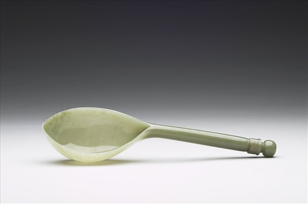 淺豆綠色玉,琢一長柄杓,杓與長柄是一塊玉雕成,基本光素。僅柄端雕葉紋。