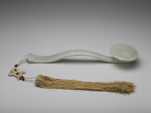 玉色白中透青。裝飾分三部份,首部中央頂端為一卍字圖案,下連一蝠啣磬,磬下連一壽字,取其諧音有「萬福慶壽」之意,左右亦飾有二蝠;柄中央也浮雕蝙蝠啣磬紋,下連雙魚,寓「萬福有餘」;柄尾浮雕蝙蝠銜一水仙,則諧「富」貴神「仙」之意。柄尾附黃色編花雙穗。