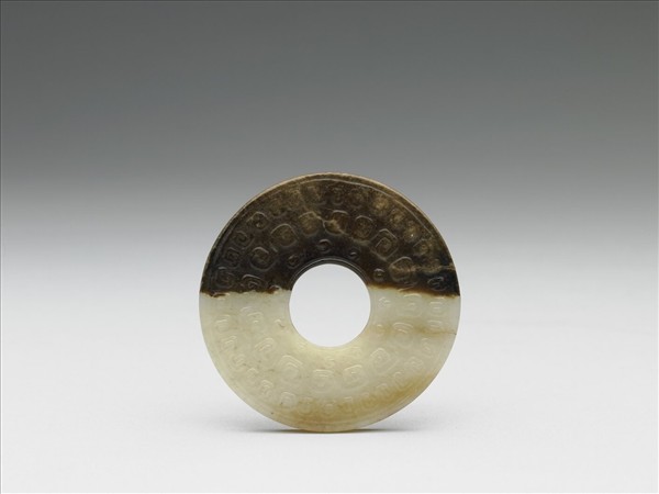 玉璧,器身有細璺,一面飾有回紋及穀紋,一面為對稱紋樣。