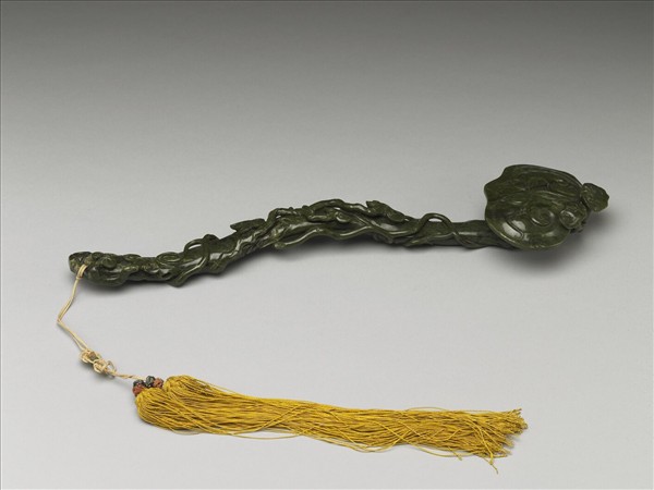 玉雕靈芝一本,靈芝形之首頂浮雕小芝二;柄略彎曲,鏤雕藤蔓攀繞,小芝附生。趾端繫黃雙穗、飾結。