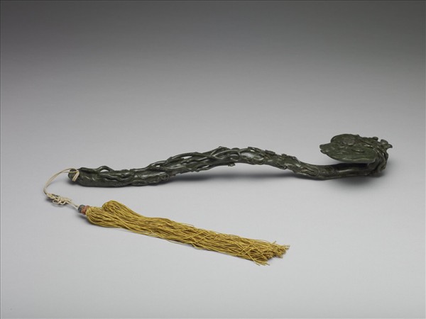 玉質近墨綠色。整體作靈芝形。首面頂端垂覆凸起之蒼松,右下角浮雕一蝙蝠,芝幹狀之柄上盤繞古梅,枝、花皆凸雕鏤空。含「福壽長春」之意。尾附黃色編花雙穗。