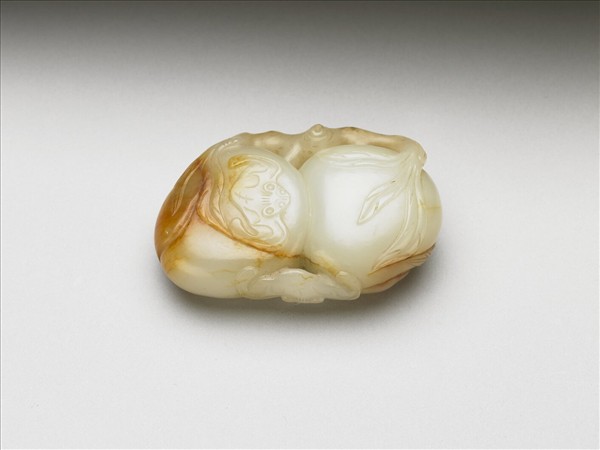 玉質,白色,局部帶有黃褐色玉皮,可能用河中耔料雕成。全器作連蒂雙桃,枝幹粗,桃上浮雕兩蝙蝠。蝙蝠取蝠之諧音「福」,桃象徵長壽,桃實和蝙蝠均成雙成對,此器因而有「福壽雙全」的吉祥喻意。此白玉雙桃於清宮中,被收儲於蒔繪漆盒內。