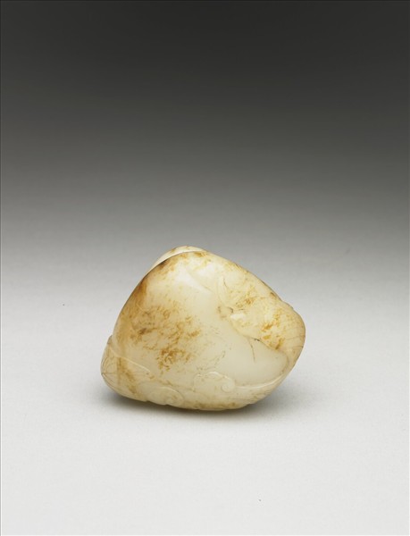 玉質,白色,局部呈褐色。器作桃形,器表淺浮雕蝙蝠。此器取蝠之諧音「福」,與象徵長壽的桃實,而有「福壽」之吉祥喻意。於清宮被收儲於一六邊形蒔繪漆盒之中。
