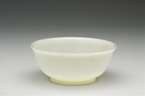 白玉。侈口、深腹、淺圈足。外底心琢「乾隆年製」隸款。