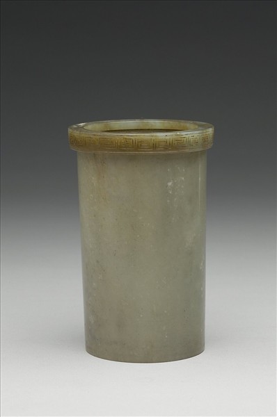 灰玉,雜白斑點。圓筒形,一端口緣處側出一圈,飾以陰刻回紋。