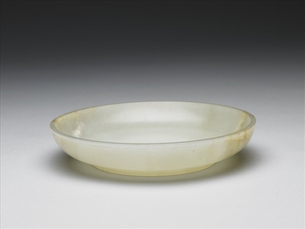 玉質,玉色泛白,有片狀赭斑。直口、弧形壁,有圈足。器底圈足內有六字篆書款:「大清乾隆年製」。