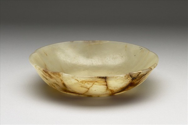 玉質,玉色泛黃,有大片赭斑,器身有多處裂璺。五圓瓣葵花式口,稍外撇,弧形壁,有圈足。器底圈足內有四字隸書款:「嘉慶年製」。