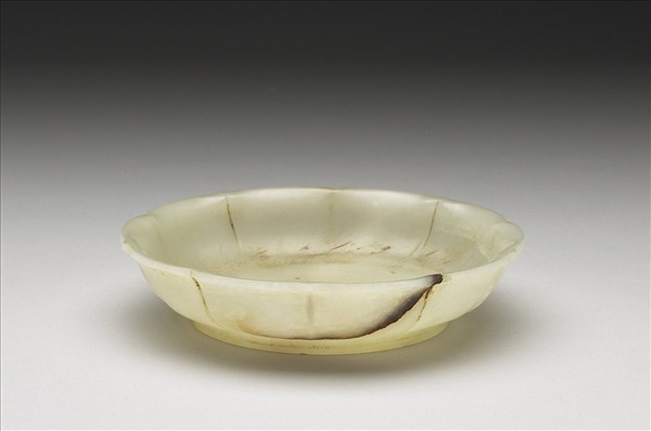 玉質,玉色泛黃,口沿有片狀赭斑。五尖瓣菱花式口,稍外撇,弧形壁,有圈足。器底圈足內有四字隸書款:「嘉慶年製」。