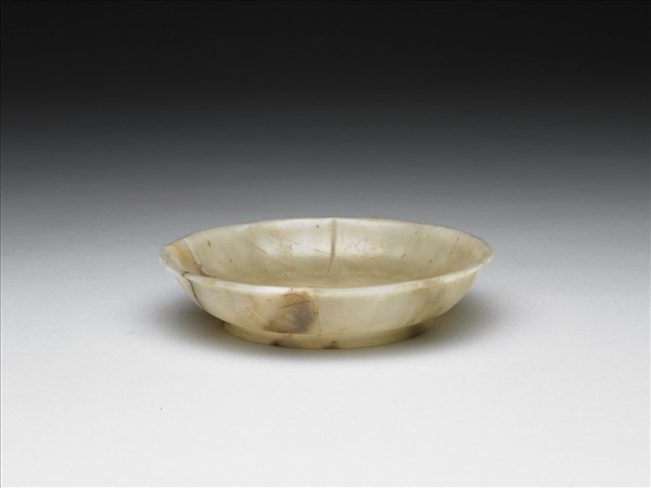 玉質,玉色泛黃,有白綹及片狀赭斑,器身有多處裂璺。五尖瓣菱花式口,稍外撇,弧形壁,有圈足。器底圈足內有四字隸書款:「嘉慶年製」。