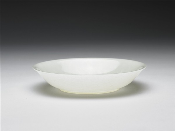 玉質,玉色泛白,有白綹。口外撇、弧形壁,有圈足。壁薄可透光。