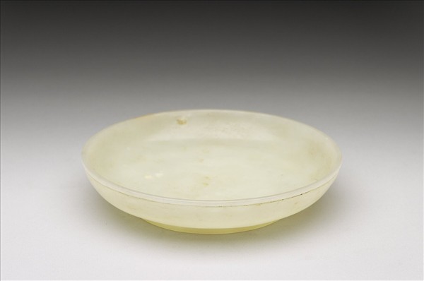 玉質,玉色泛黃,有赭斑。直口、弧形壁,有圈足。器底圈足內有六字篆書款:「大清乾隆年製」。