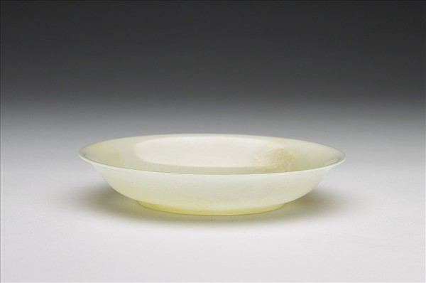 玉質,玉色泛黃,有白綹。口外撇、弧形壁,有圈足。