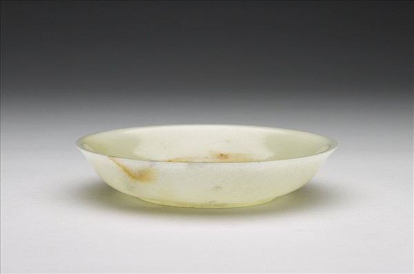 玉質,口沿處有灰斑及赭斑。口外撇、弧形壁,有圈足。