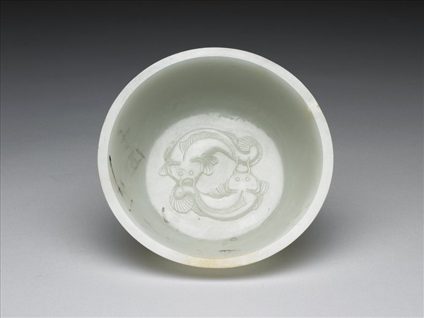 玉質,玉色泛灰,口沿有些許赭斑。口稍外侈,弧形壁,平底。碗內淺浮雕雙鯰魚。