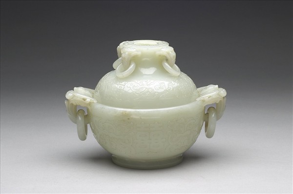 玉質,琢作帶蓋香爐。器蓋高,器身深。蓋頂捲翻,上方高聳且上沿琢如意雲頭紋一周,四周鏤雕四束靈芝,各垂一活環。蓋面輪番鋪陳淺浮雕的四個「囍」字,及四隻圖案化龍紋。器腹琢二「囍」字,「囍」字左右各淺浮雕一圖案化龍紋。由器腹左右向上伸出一束花葉,花似含苞,分披之雙葉似莨苕葉,從器口沿高浮雕一展翅蝙蝠,蝙蝠之嘴部啣著花苞,花莖形成環柄,各垂一活環。