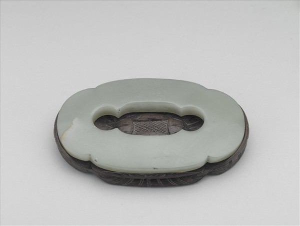 海棠形玉環,青玉,部分沁褐,有璺。各鑿面皆平整,打磨光滑。附海棠花木座一只。