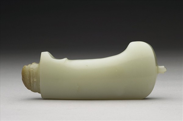 玉琢作短刀的刀柄,與刀背同一邊的部位琢成平直邊,以卡榫與刃部連接,光素無紋,僅頂部有花式小鈕。