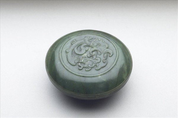 碧玉,玉略乾澀。圓形扁盒,矮圈足。蓋頂浮雕圓線為界,內雕蟠龍一,餘光素。