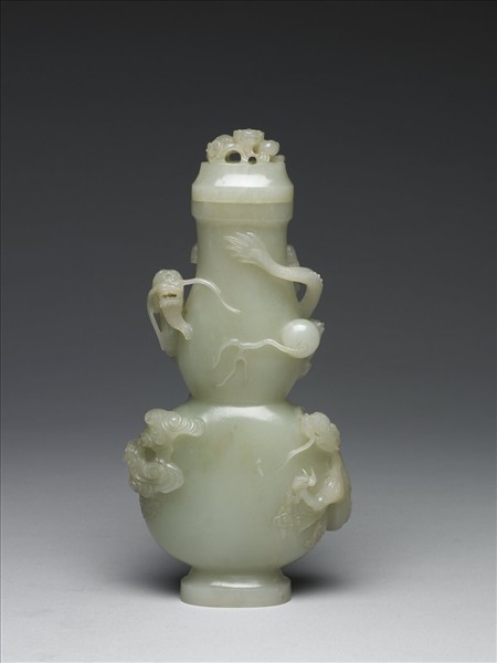 玉質。扁瓶,作葫蘆形,圈足,帶蓋。器身高浮雕雙龍搶珠,蓋頂停佇一蟠螭。