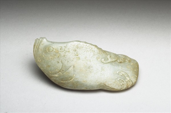 青玉,有黃斑。鱖魚形,頭部上仰,作欲衝出水面狀,魚身為海浪所掩蓋,神態唯妙唯肖。
