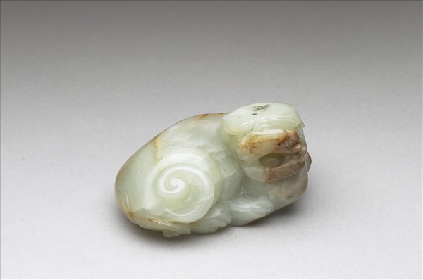 玉質。帶黃赭斑。似虎形,坐臥狀,五官較簡略,頗生動。