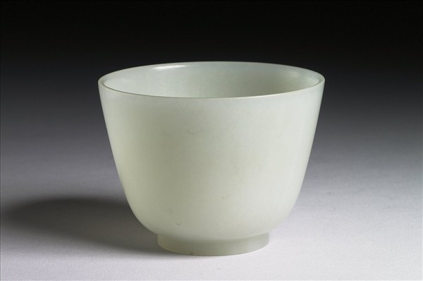 玉杯,平口,深壁,矮圈足。光素無紋。器偏薄。