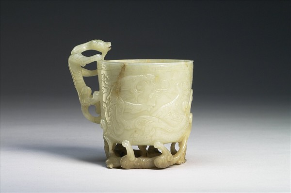 玉質,有赭斑、黑斑。直口,深腹,把手作一螭形,底端以兩螭盤成鏤空的圈足,器壁浮雕雲紋及龍鳳一對、火珠。