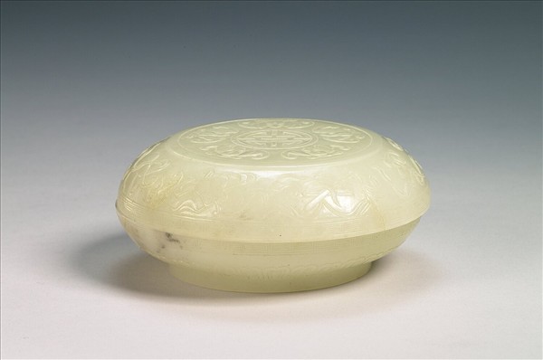 玉質扁圓盒,蓋與器身相等,有圈足。蓋頂中央琢五蝠環繞團壽,蓋面近扣合口沿處琢暗八仙圖案,器身近底飾蓮瓣一周。