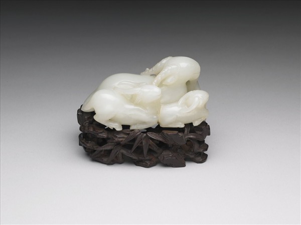 玉質,色瑩白微帶青色。器立雕一大二小羊隻,作跪伏狀彼此相依,羊雙角、杏眼,頜下有鬚,造型乃取「三陽開泰」之意。附鏤空靈芝竹石木座一。