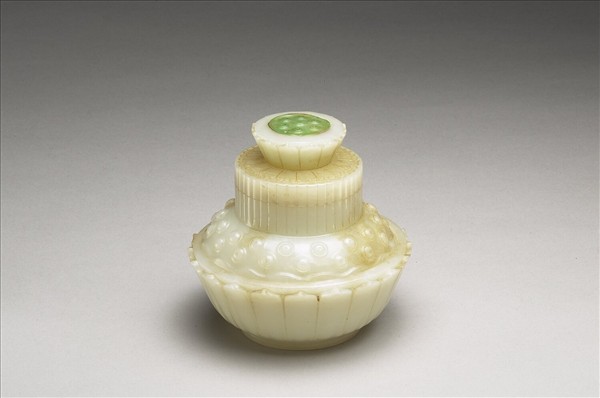 玉質,色白潤,玉嵌碧綠玉,帶煙薰痕。器作一蓮花托著蓮蓬,分上、中、下三截,分別為小蓮蓬、大蓮蓬與蓮花。其間又琢有垂直的成束花莖。分為三截時,第二、三兩截器身內均可貯物。組裝時,似白玉蓮花托著白玉蓮蓬,上面又有碧綠小蓮蓬,附木座。