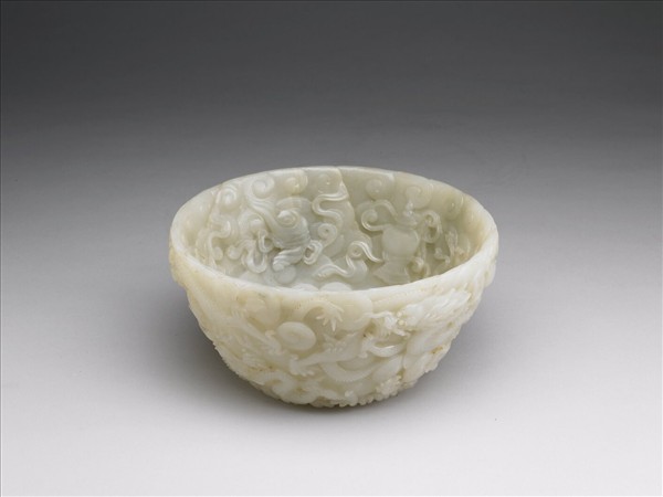 玉質,色青白瑩潤微有黃斑。侈口,斜壁,深腹,平底。器外浮雕多隻穿雲龍,外底雕向外旋出波濤紋,內面以捲雲紋為地,雕輪、螺、傘、華蓋、瓶、盤常結六件,與底心雙魚拱一蓮花構成八吉祥。全器以深淺有致的浮雕顯出豐富的層次,刀工細緻靈動。