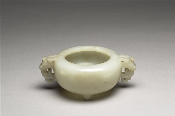 玉質,色青白有灰斑。斂口,碩腹,平底,底有三乳足,器面光素無紋,二側各立雕一龍首,張口吞噬立鳥的頭頂。但紋飾已幾何化甚,不易辨認。