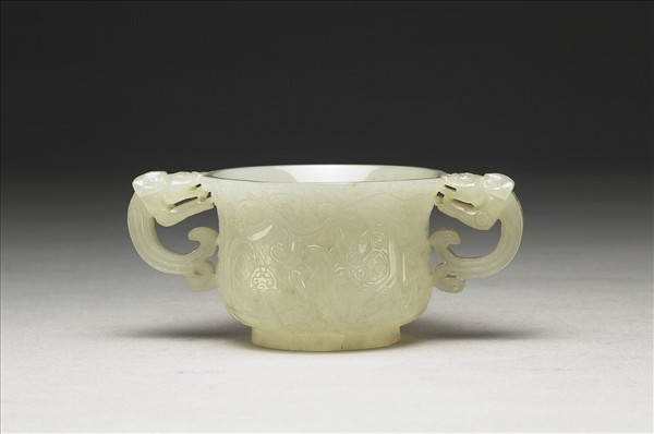青⽩⽟質,拋光晶亮。侈⼝微撇,深腹,矮圈⾜,雙⽿。⽿雕攀附在杯緣的夔 龍,龍有⾓⻑吻,尾巴有雙股。器腹以回紋為地,淺雕龍鳳紋。