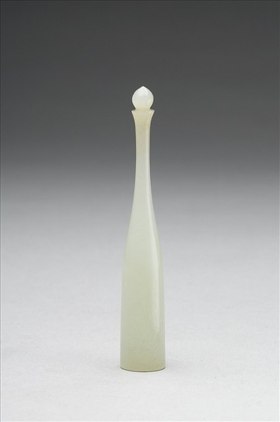 玉質,淺湖綠近白色。長圓柱形,上小下大,頭尖端琢作小圓桃形。