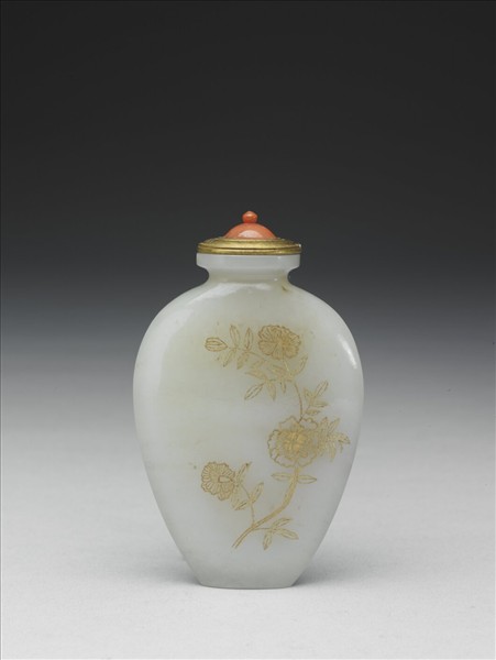扁瓶形,兩面皆淺刻折枝石竹,並填金為飾。帶銅嵌珊瑚蓋與牙匙。