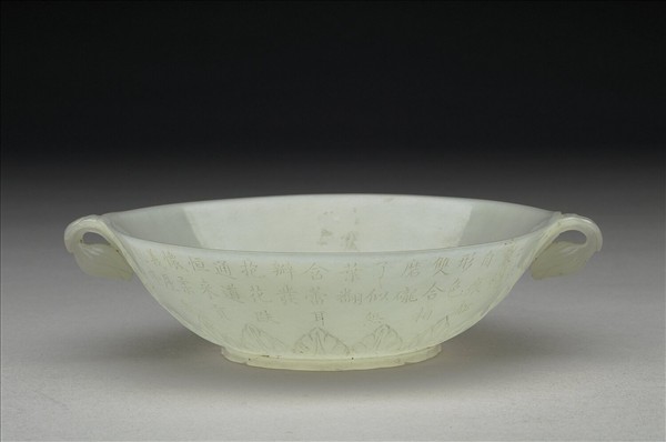 玉質。琢作一撇口淺腹的圓碗,碗底雕琢一平展的罌粟花, 交叉覆疊的四片花瓣,帶花蕊,周圍繞一圈莨苕葉。自兩側下方沿著腹壁向上伸長莨苕葉至口沿處,捲折一下垂的花蕾。1770年被送入清宮,乾隆皇帝為之賦詩,並將詩加刻在外。內壁中央刻「乾隆御用」四字篆款。