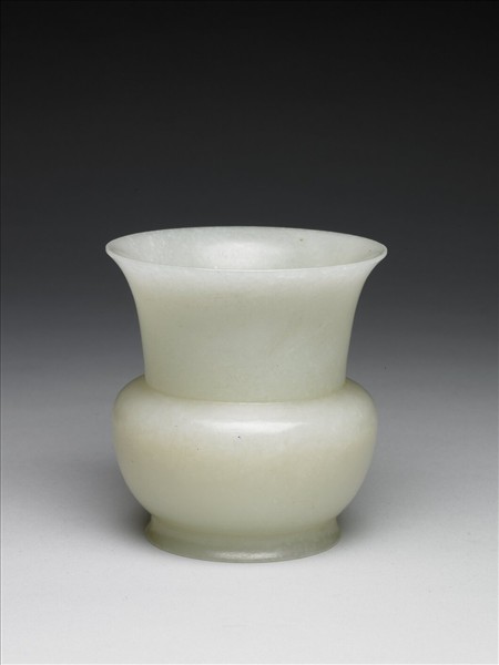 玉質。渣斗,口沿外撇,直長頸,圓腹,圈足,作盛裝的容器。外壁光素無紋,底有「大清乾隆年製」六字篆款。與另一件青玉渣斗同儲於木匣內。