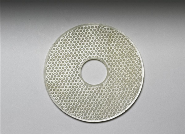 玉質。圓璧形,中孔略小。內、外緣各作陰線紋一周,器一面琢蒲紋;一面琢乳丁紋。原貯於一木圓盒,並墊以錦墊。