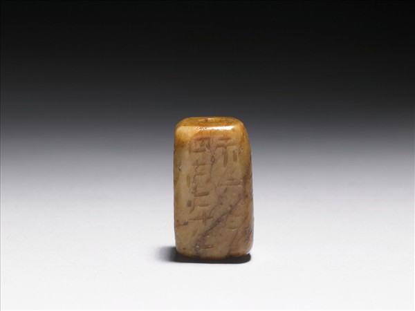 玉質,玉色密潤但有璺。器作長四面體,上下對穿大孔以配戴。器四面刻讖語,內容為對鬼神的讚頌與命令,惟本件磨損嚴重內容難以辨認。